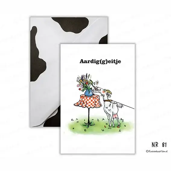 Tekst: Aardig(G)eitje. De kaarten worden geleverd met bijpassende koeienvlekken enveloppen!
