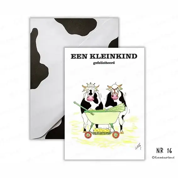De koeienkaart is afgebeeld met 2 koeien te weten opa en oma koe en een kinderwagen. Tekst: Een kleinkind gefeliciteerd. De kaarten worden geleverd met bijpassende koeienvlekken enveloppen!