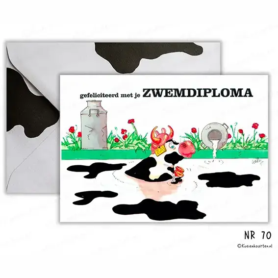 De koeienkaart is afgebeeld met een koe in de sloot. Tekst: gefeliciteerd met je zwemdiploma. Hij word geleverd met bijpassende koeienvlekken envelop!